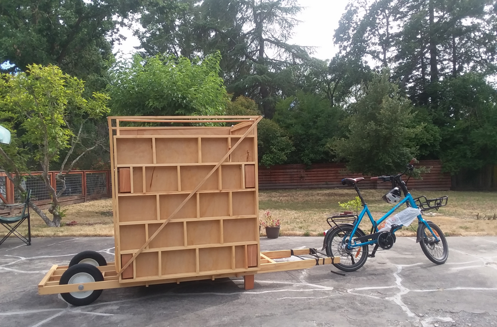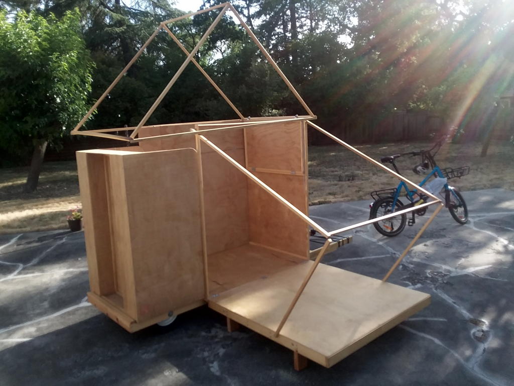 The mobile micro-homes are quite versatile. They are incredibly small and lightweight, so they can usually be moved around on foot, or towed by bicycle, which allows you to easily travel wherever you want. They can easily be biked down the side of the road, or along a bike trail, until you reach your favorite campgrounds. They offer a cozy space whether you park overnight in a parking lot, or you tow it out into nature for a week of solitude. And because they hold their shape, unlike a tent, they give you a greater sense of continuity and comfort, even if you're always on the move. They allow you to insulate yourself from the world when needed, but also prevent you from completely shutting out the world since you're both visible and approachable while you're moving it around. People love to see how they fold and unfold!