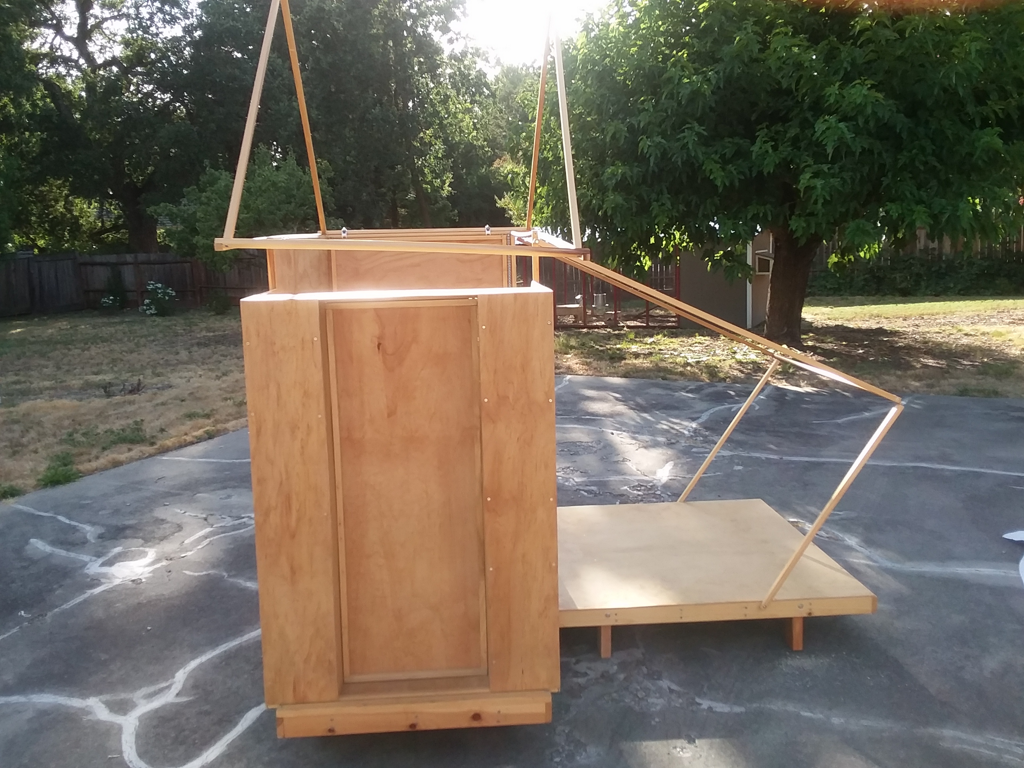 The frame on the "side-room", made to hold the canvas in place, is at such odd angles because this was also designed to swing out on it's own. The canvas wouldn't be at such an odd angle, the canvas would just hang straight down and wrap around the bottom of the floor. As the floor is folded up, the angle collapses, until it rests flat against the side of the camper. No assembly required. It rests so flat against the camper that the roof folds down around it in such a way that it gets squeezed into place, flush with the bottom of the fold-out floor. (video coming soon...)